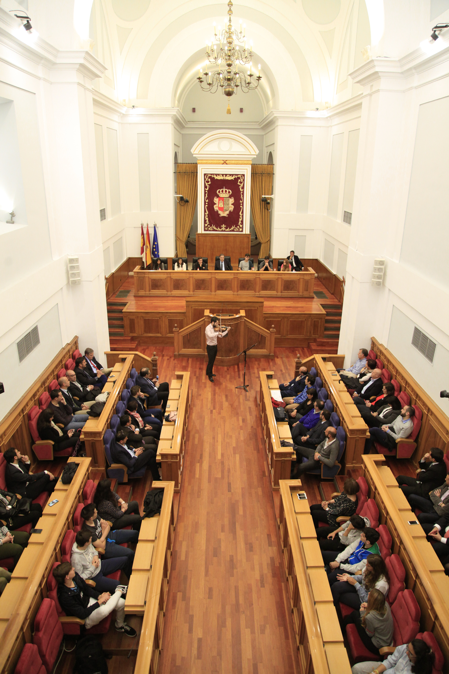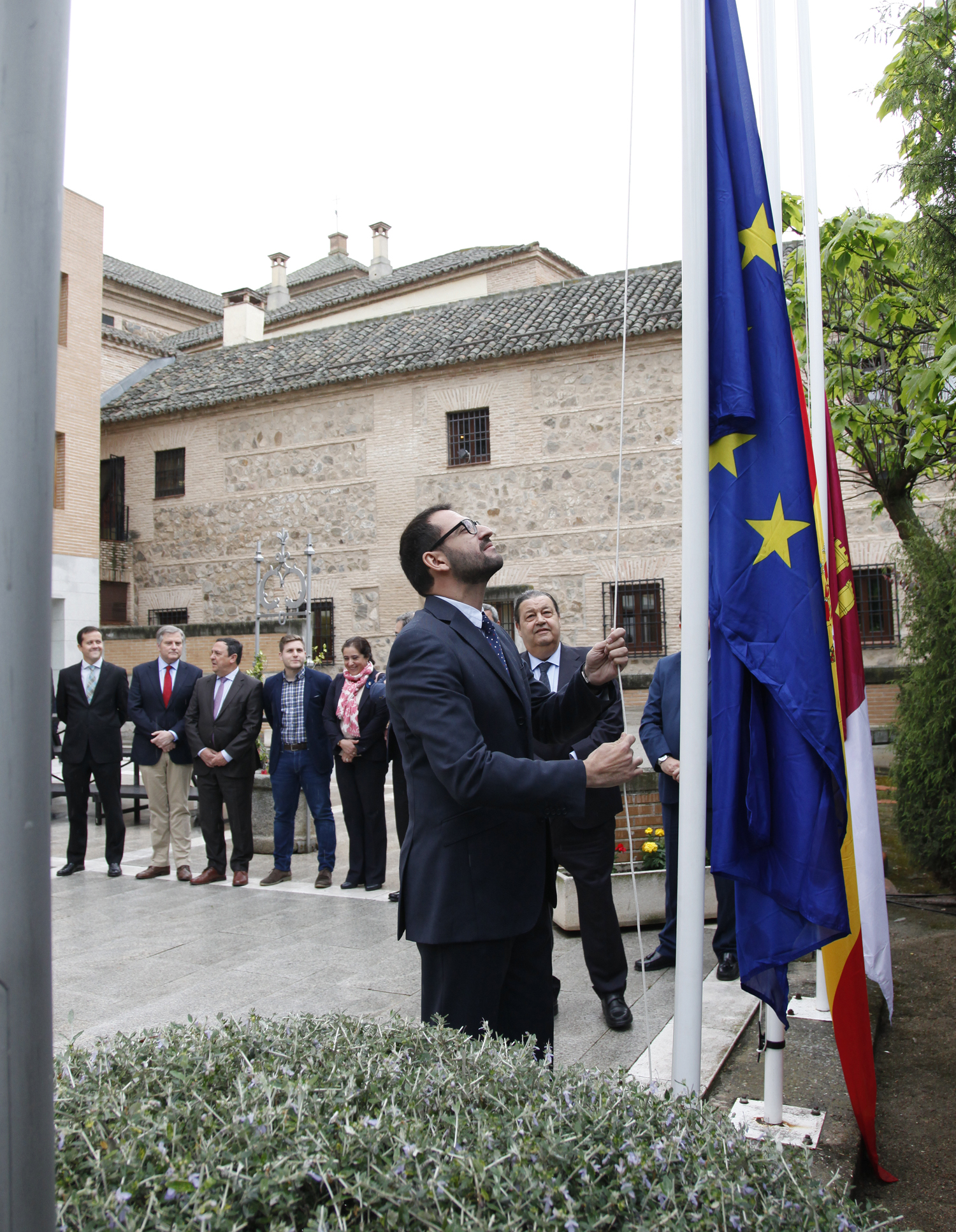 El acto, iniciado con el izado de las banderas de Europa, España y Castilla-La Mancha, mientras alumnos y alumnas del Conservatorio Jacinto Guerrero de Toledo interpretaba el Himno de la Alegría, fue presidido por Jesús Fernández Vaquero, presidente de las Cortes de Castilla-La Mancha. En el mismo participaron el eurodiputado, Sergio Gutiérrez del Grupo Socialista; José Luis Martínez Guijarro, vicepresidente del Gobierno regional, y Alberto Faccioli, en representación de los alumnos Erasmus.
